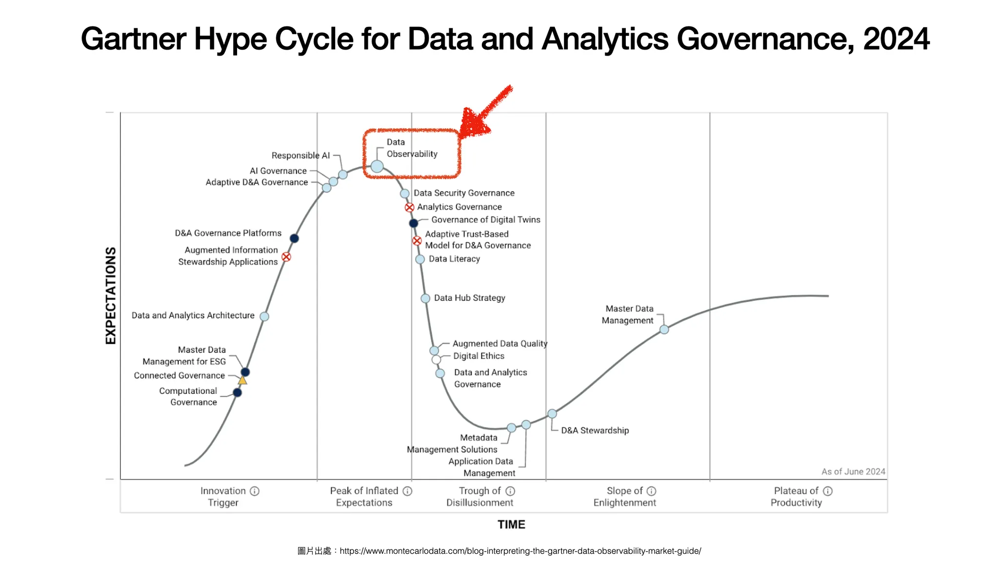 Gartner 在 2024 有出現過 Data Observability,而且位於 peak of inflated expectations 的高峰位置。