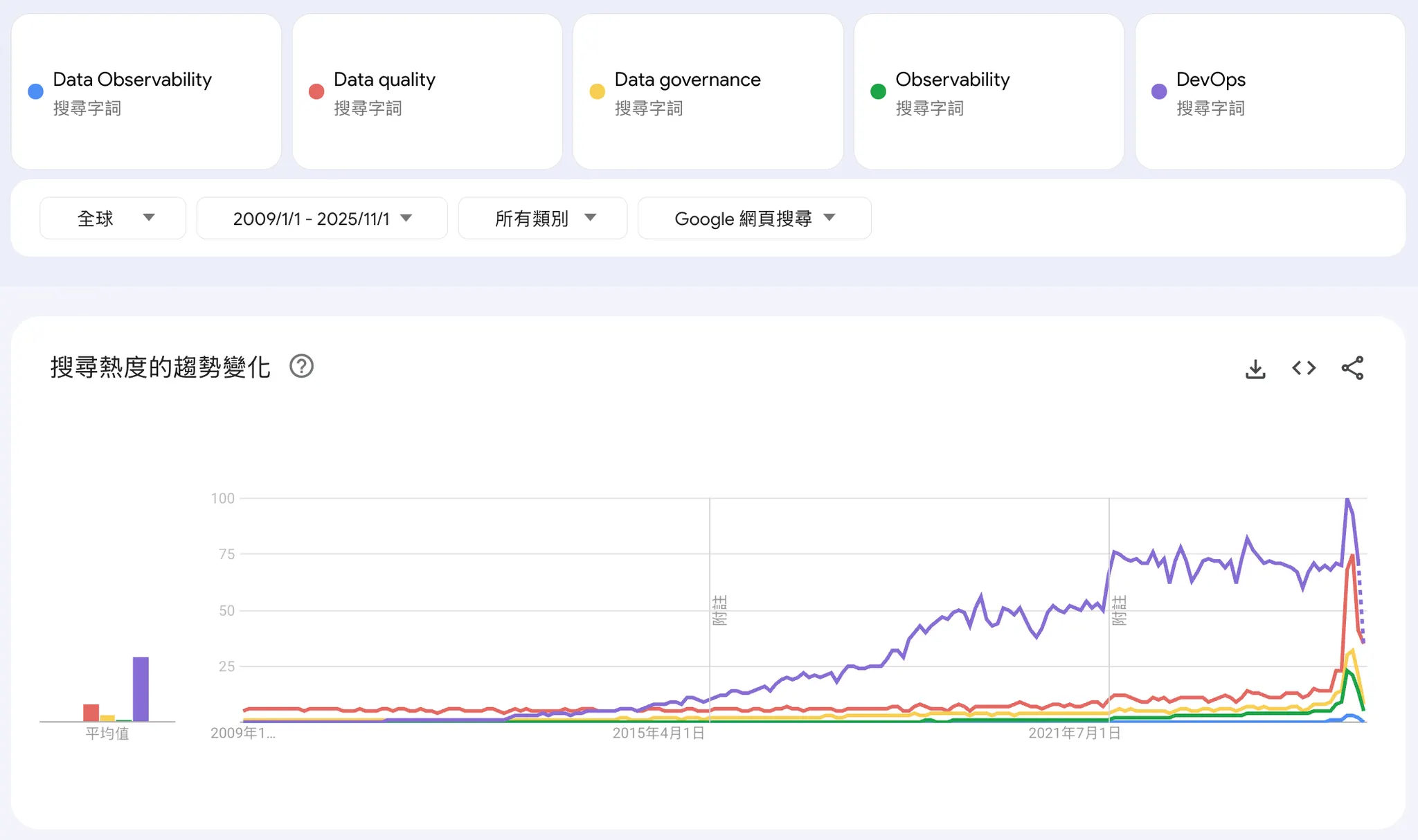 打開 Google Trends,輸入「Data Observability」,從圖中可以發現在 2019 年以前,這個詞幾乎無人關注,直到 2020 年12月才開始有了起色,然後維持一個小眾的熱度,最後到了 2025 終於熱度有明顯的上升。